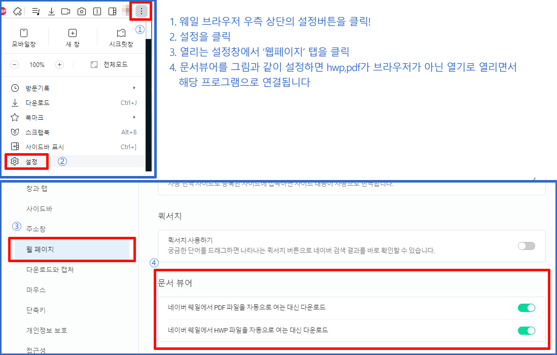 ※ 네이버웨일 브라우저 사용시 hwp,pdf가 브라우저로 열리는 경우 문제해결방법 클릭!